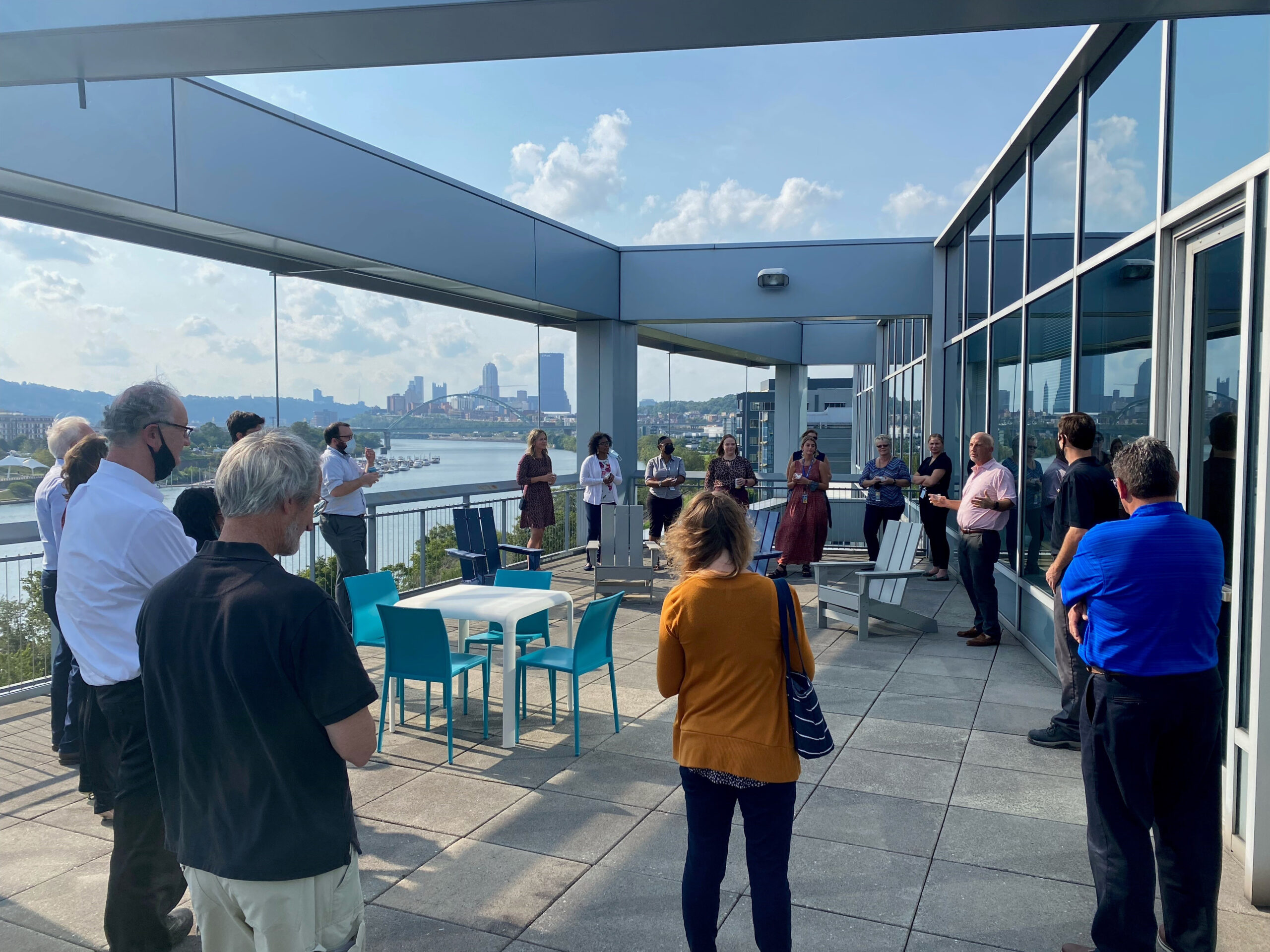 Community members from throughout Bridgeside Point One enjoyed complimentary cocktails on the facility’s scenic rooftop courtyard overlooking the Monongahela River at the inaugural community activation event hosted by TUFF and Collaborative Real Estate on September 14, 2021. Titled “Building the Bridge,” the goal of the event was to introduce intentional facility-based programming and brainstorm as a community new ideas for continued collaboration between tenant departments and the outside community.